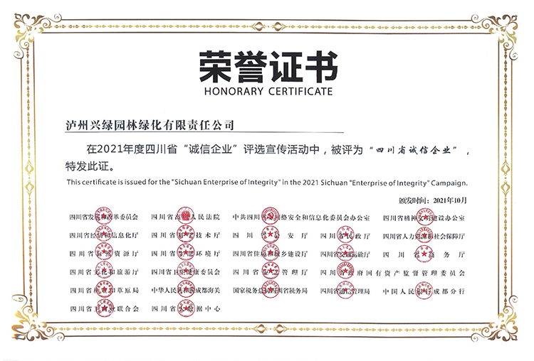 由省發(fā)改委等25個(gè)省級(jí)部門(mén)聯(lián)合主辦的2021年四川省“誠(chéng)信企業(yè)家”“誠(chéng)信企業(yè)”評(píng)選宣傳活動(dòng),經(jīng)過(guò)為期半年的報(bào)名、初審、網(wǎng)絡(luò)投票、專(zhuān)家評(píng)審、名單公示,瀘州興綠園林綠化有限責(zé)任公司在全省報(bào)名參評(píng)的9000多家企業(yè)中脫穎而出,獲評(píng)“誠(chéng)信企業(yè)”并被納入信用中國(guó)(四川)網(wǎng)站紅榜名單,入冊(cè)四川省“誠(chéng)信企業(yè)”名錄。
