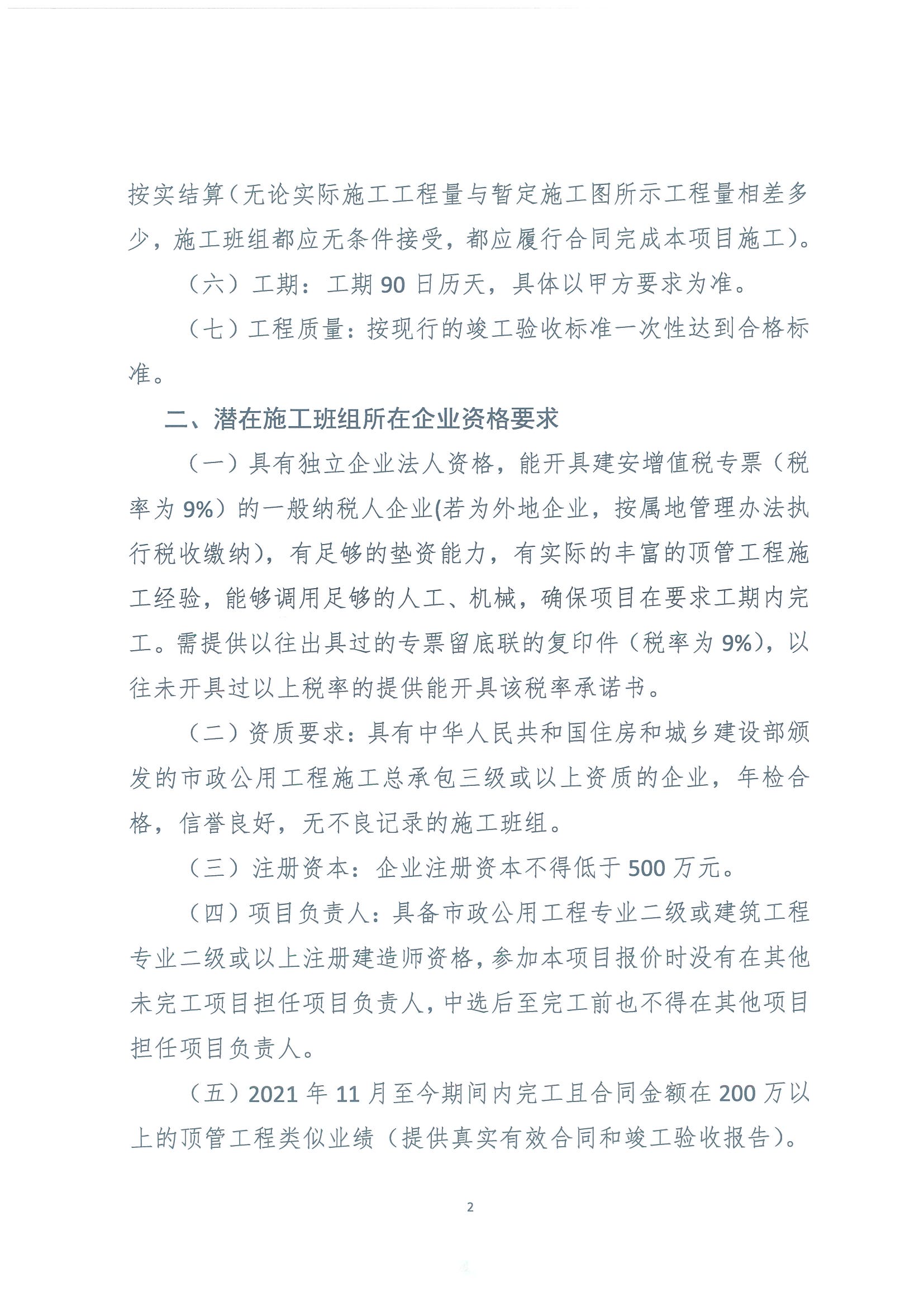(二)資質(zhì)要求:具有中華人民共和國住房和城鄉(xiāng)建設(shè)部頒發(fā)的市政公用工程施工總承包三級(jí)或以上資質(zhì)的企業(yè),年檢合格,信譽(yù)良好,無不良記錄的施工班組。