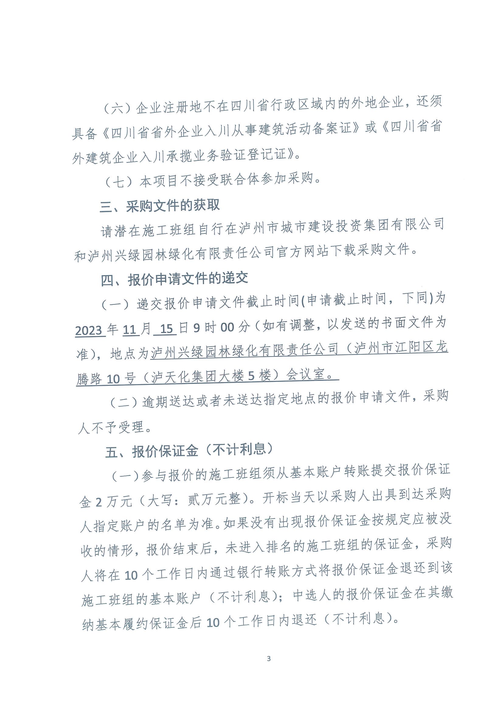 (一)遞交報(bào)價(jià)申請文件截止時(shí)間(申請截止時(shí)間,下同)為2023年11月15日9時(shí)00分(如有調(diào)整,以發(fā)送的書面文件為準(zhǔn)),地點(diǎn)為瀘州興綠園林綠化有限責(zé)任公司瀘州市江陽區(qū)龍騰路10號(hào)(瀘天化集團(tuán)大樓5樓)會(huì)議室。