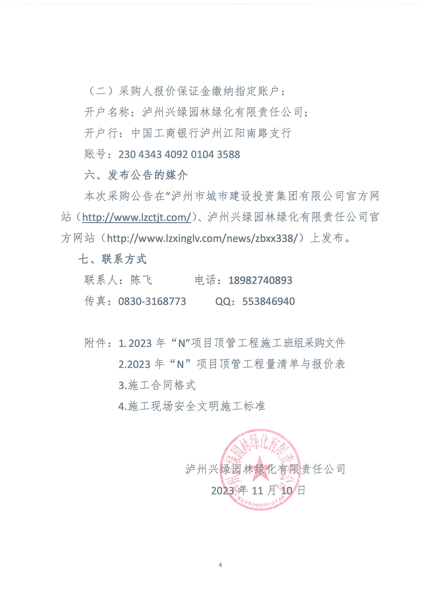 (一)2023年“N”項(xiàng)目由瀘州興綠園林綠化有限責(zé)任公司承擔(dān)實(shí)施,現(xiàn)采購人瀘州興綠園林綠化有限責(zé)任公司依據(jù)工作安排,通過詢價(jià)方式選擇和確定本項(xiàng)目頂管工程施工班組。