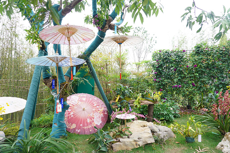 全園植物造景以雅致為特色,形態(tài)古樸,品種選取瀘州市花桂花、市樹(shù)桂圓,及曾唯一入選北京奧運(yùn)的荔枝品牌“帶綠”,還有蘭花、金釵石斛等體現(xiàn)瀘州特色,并通過(guò)綠植、奇石相互輝映講述瀘州的山石之美與豪邁熱情,還以瀘州非物質(zhì)文化遺產(chǎn)分水油紙傘為靈感設(shè)計(jì)創(chuàng)意構(gòu)筑,與新型光電技術(shù)互動(dòng)光影屏相依而立,展現(xiàn)了古與今的對(duì)話(huà),實(shí)與虛的結(jié)合,充分展示酒城工匠的作品與藝術(shù)造詣。